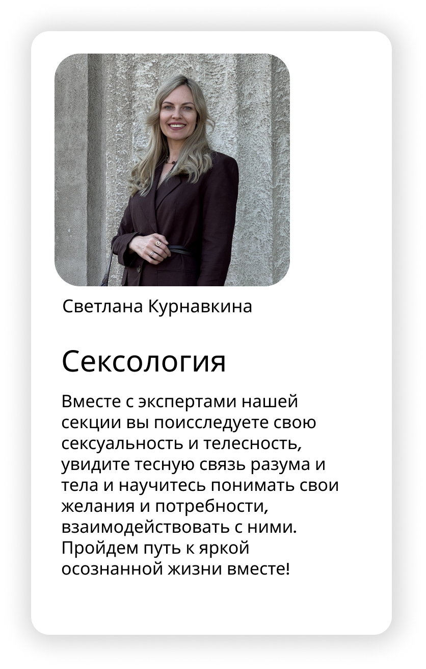 Вместе с экспертами нашей секции вы поисследуете свою сексуальность и телесность, увидите тесную связь разума и тела и научитесь понимать свои желания и потребности, взаимодействовать с ними. Пройдем путь к яркой осознанной жизни вместе!