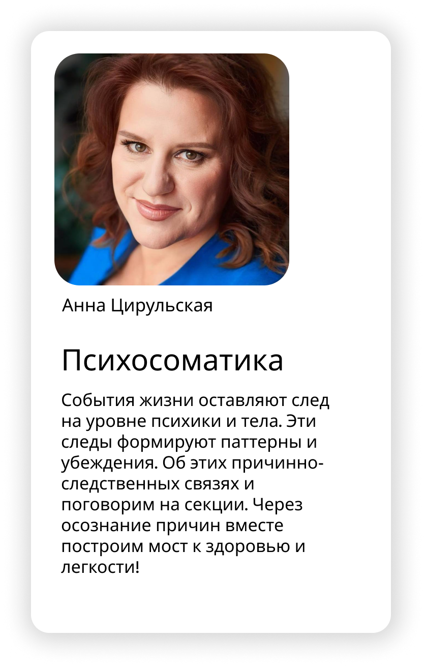 События жизни оставляют след на уровне психики и тела. Эти следы формируют паттерны и убеждения. Об этих причинно-следственных связях и поговорим на секции. Через осознание причин вместе построим мост к здоровью и легкости!